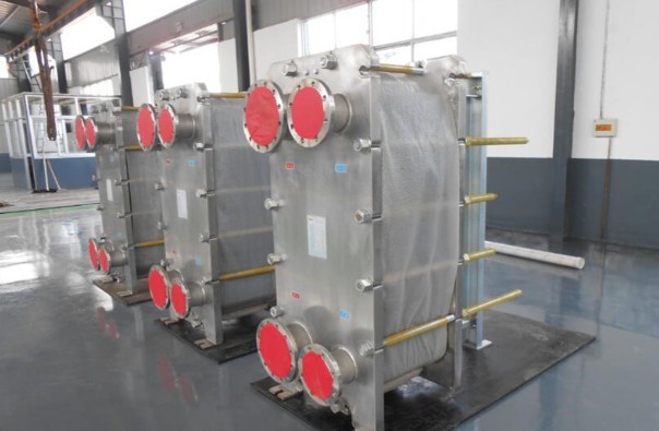 是由冲压成形的凹凸不锈钢板组成。两相临板片之间的凹凸纹路成180度相对组合,因此板式热交换器两板片之间的凹凸脊线形成了交错的接触点,将接触点以真空焊接方式结合后,就形成了板式热交换器的耐高压交错流通结构,这些交错的流通结构使得板式热交换器内的冷热流体产生强烈紊流而达到高换热效果。板式热交换器是由一组波纹金属板组成,板上有四个角孔,供传热的两种液体通过。金属板片安装在一个侧面有固定板和活动压紧板的框架内,并用夹紧螺栓夹紧。板片上装有密封垫片,将流体通道密封,并且引导流体交替地流至各自的流道内,形成热交换。流体的流量,物理性质,压力降和温度差决定了板片的数量和尺寸。波纹板不仅提高了湍流程度,并且形成许多支承点,足以承受介质间的压力差。金属板和活动板压紧板悬挂在上导杆,并由下导杆定位,而杆端则固定在支撑柱上。